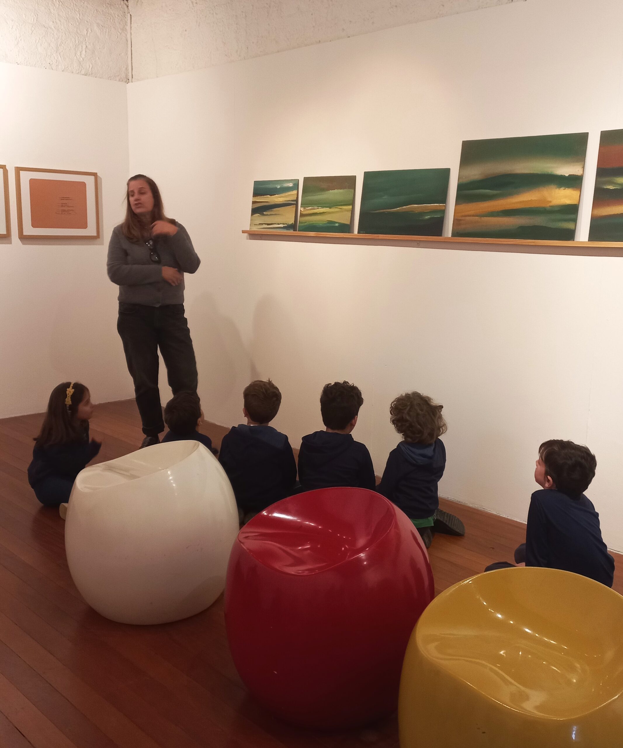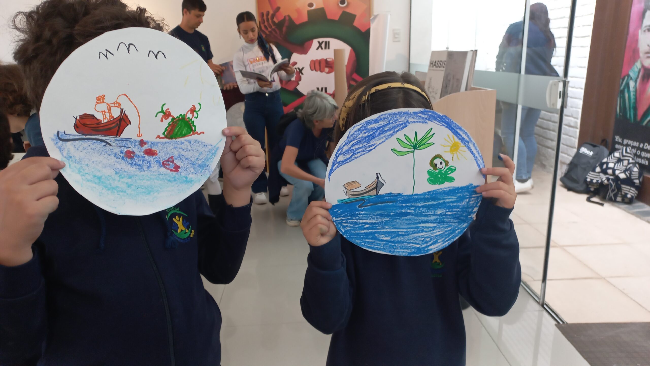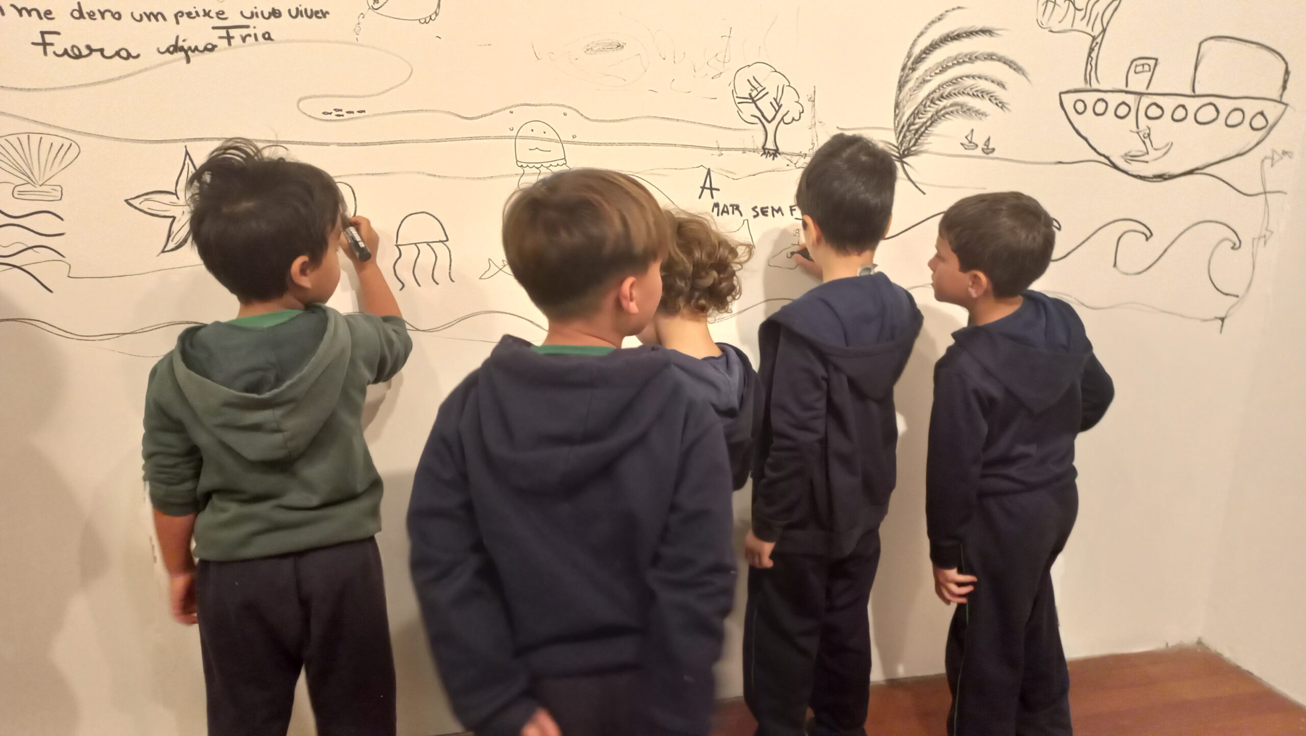 A visita ainda reuniu uma volta pela Exposição Intenso e Leve Traço de Hassis, que está acomodada na Sala Vento Sul. Ali, as crianças conheceram a série de pinturas que retrata paisagens marinhas como do encontro do céu e do mar. E aproveitaram para interagir na parede branca – com desenhos e frases de visitantes.