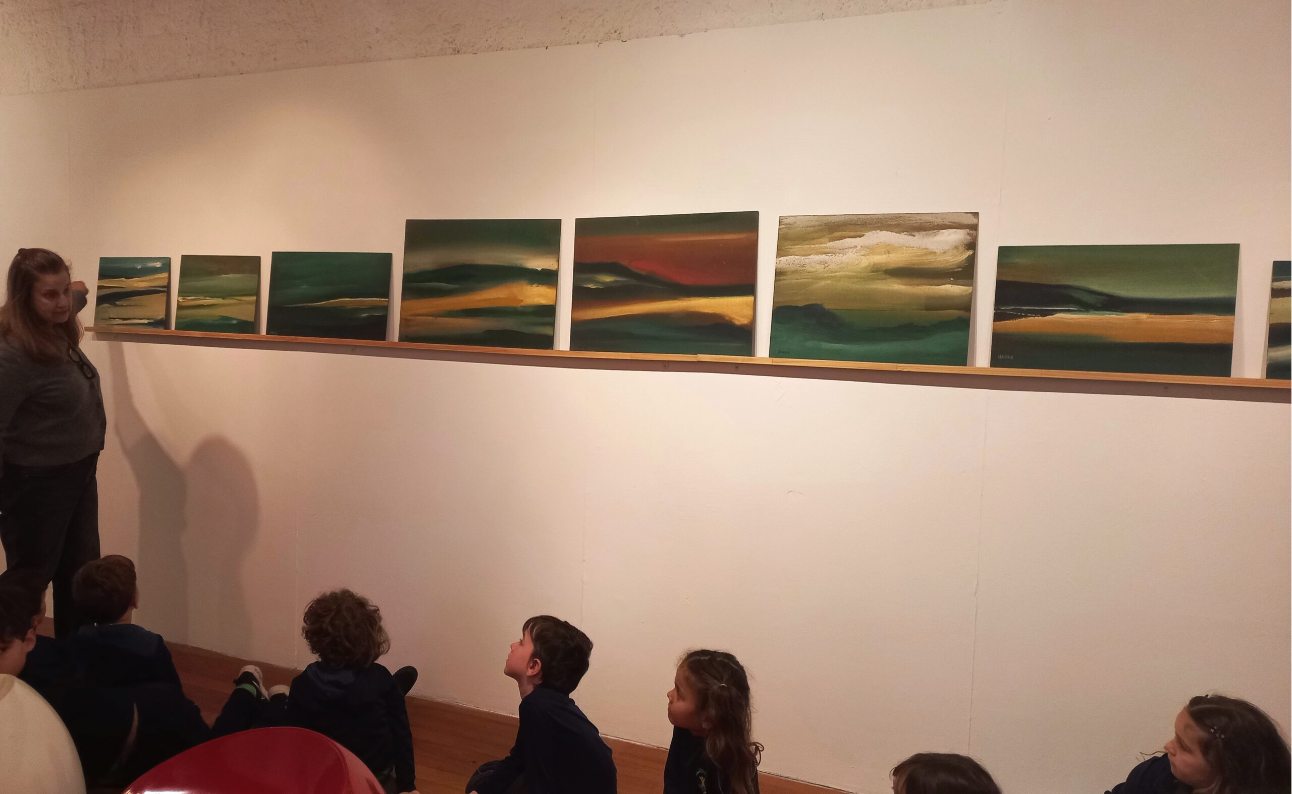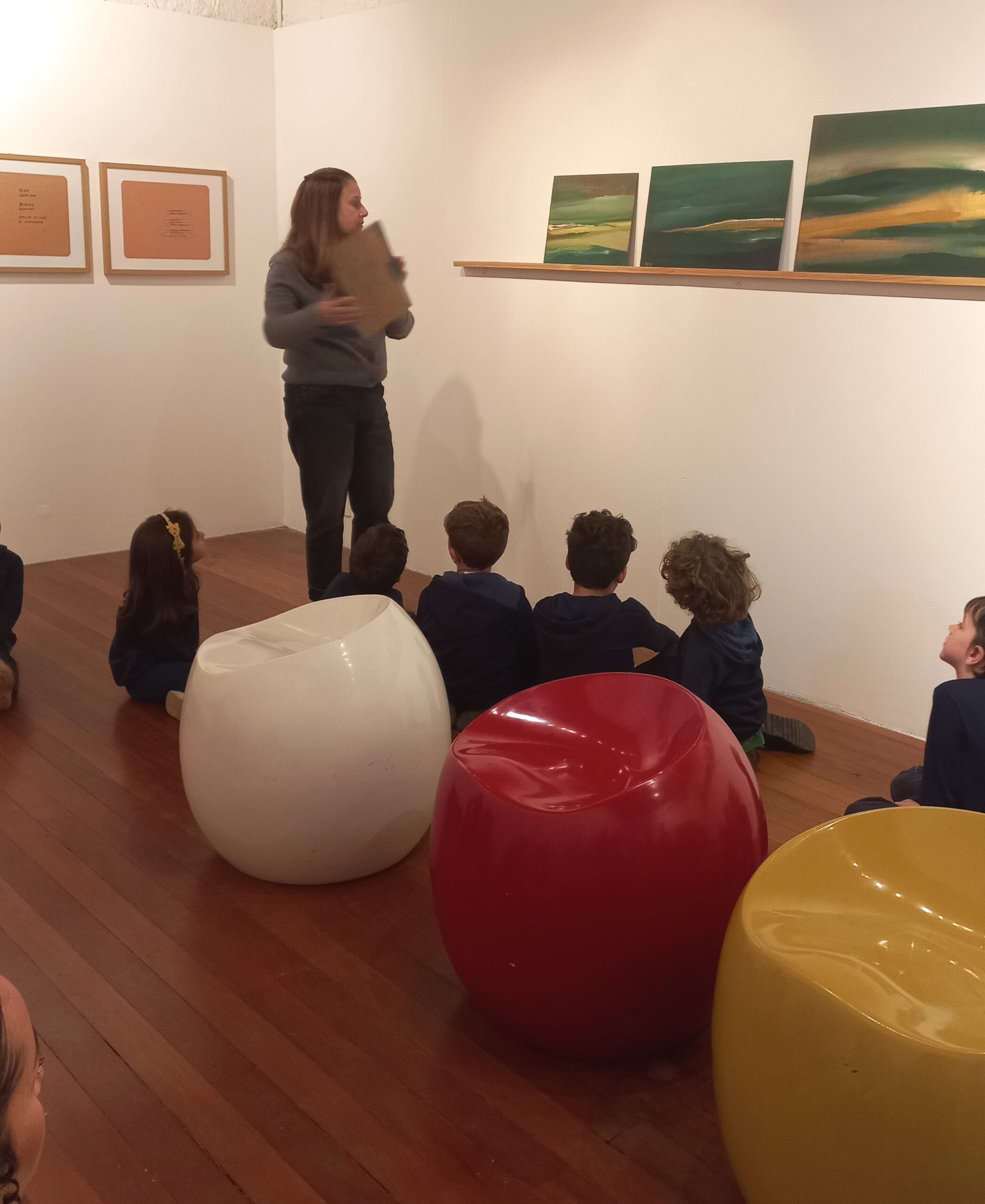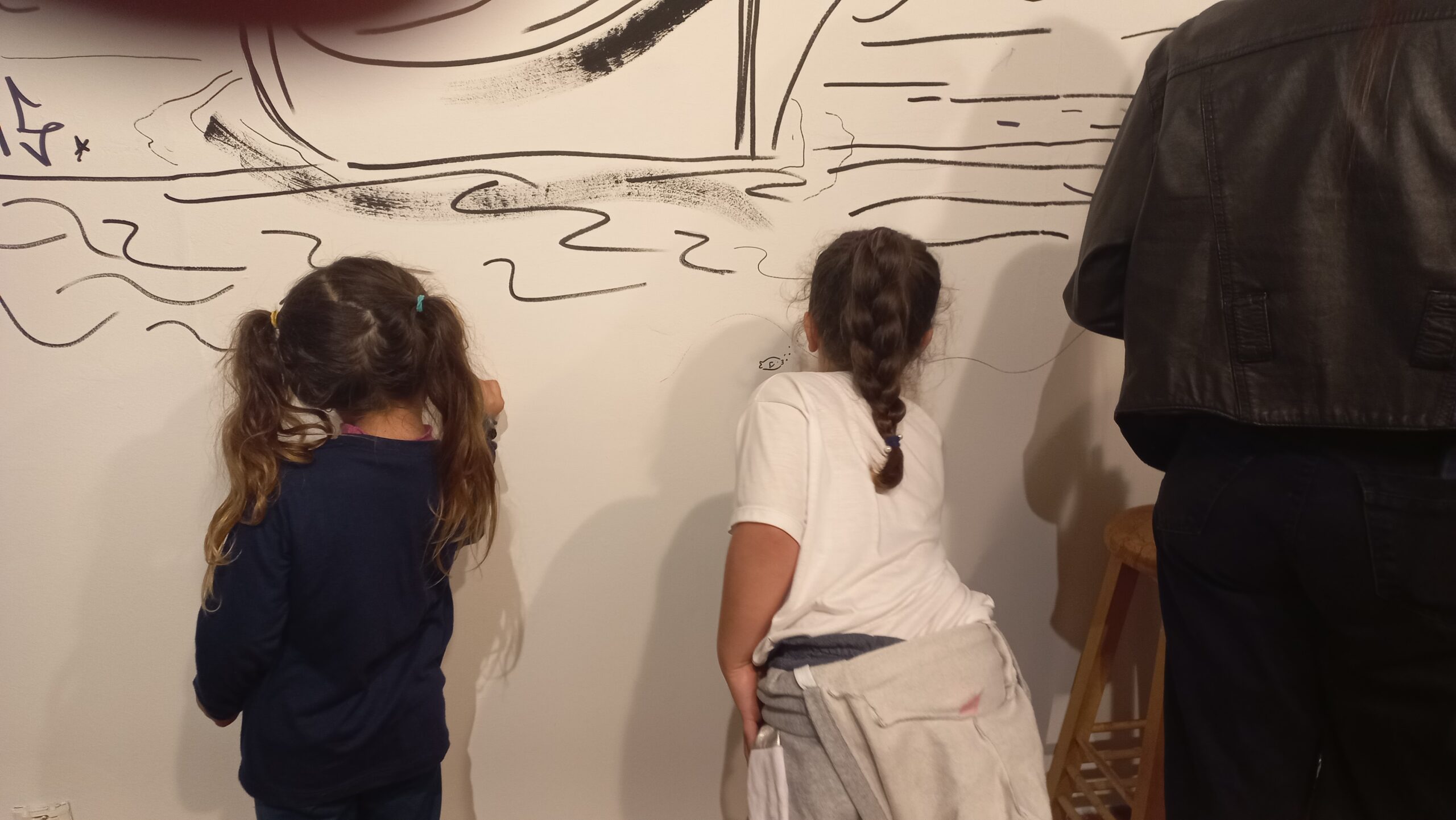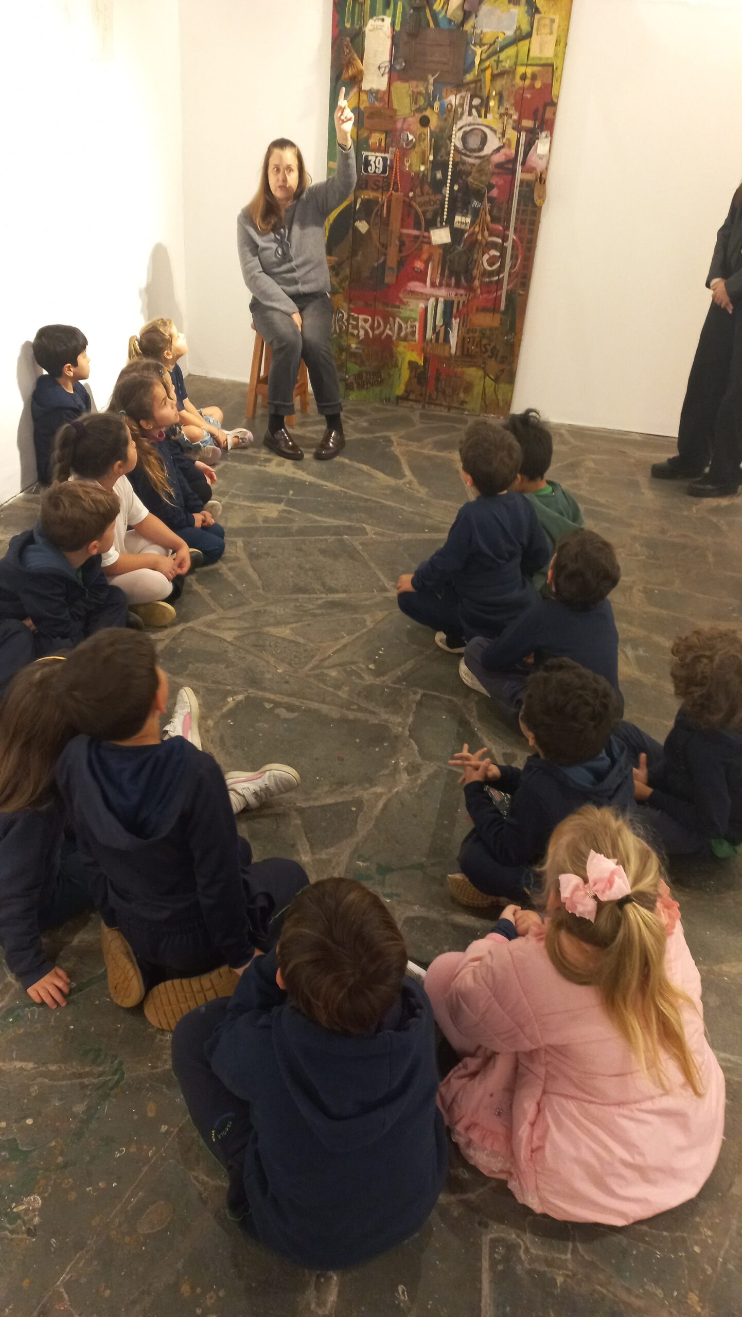 A visita ainda reuniu uma volta pela Exposição Intenso e Leve Traço de Hassis, que está acomodada na Sala Vento Sul. Ali, as crianças conheceram a série de pinturas que retrata paisagens marinhas como do encontro do céu e do mar. E aproveitaram para interagir na parede branca – com desenhos e frases de visitantes.