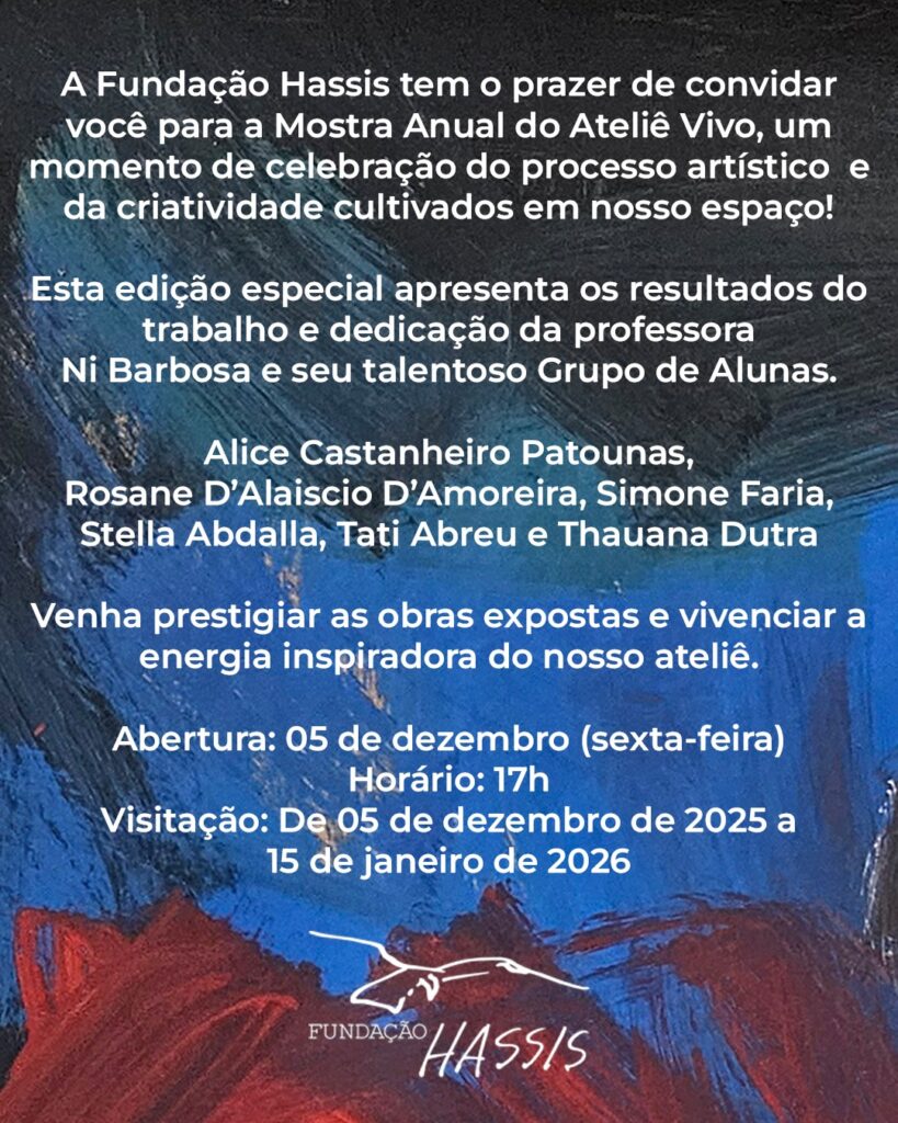 Na próxima sexta-feira, dia 5, a partir das 17h, a Fundação Hassis abre as portas para mais uma exposição de arte. Dessa vez, a mostra é dos alunos do Ateliê Vivo, projeto que encerra mais um ano de atividades com bons resultados. Ao todo, estarão na mostra 12 trabalhos que vão reunir técnica, criatividade, movimento e um olhar sensível para a arte e para o mundo.
