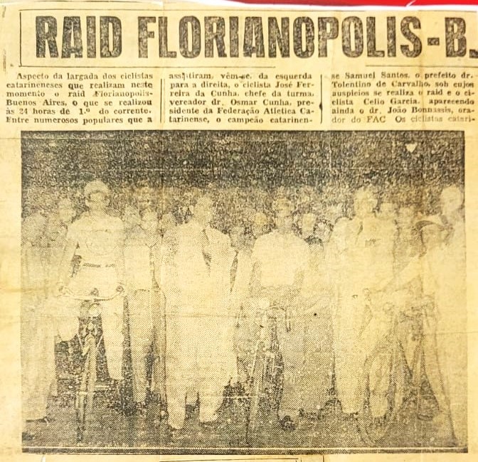 Mas sua maior façanha, ao lado de dois amigos, completa no próximo mês de janeiro 75 anos. Trata-se da viagem de bicicleta de Florianópolis a Buenos Aires em 1º de janeiro de 1951. O chamado Raid Ciclístico, um feito histórico na Capital que foi acompanhado por um “punhado” de pessoas em frente à Catedral Metropolitana de Florianópolis, de onde partiu (veja abaixo).