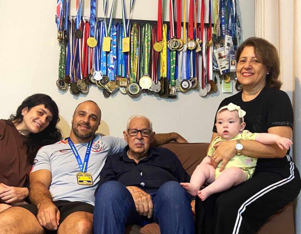 Um retrato na casa de Coqueiros: Netos Marina e Bruno, José, a filha Yara e a bisneta Olívia. Ao fundo, coleção de medalhas conquistada em campeonatos de remo pelo neto Bruno.