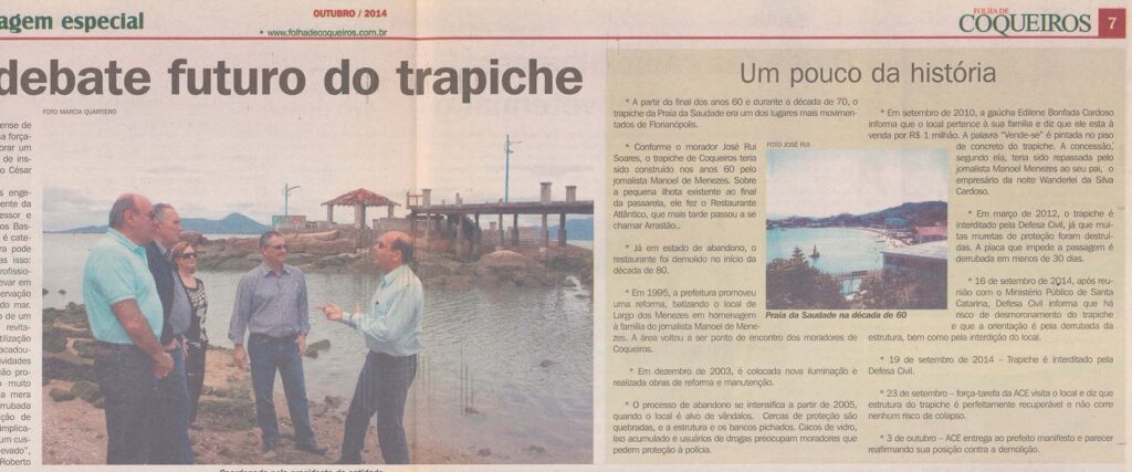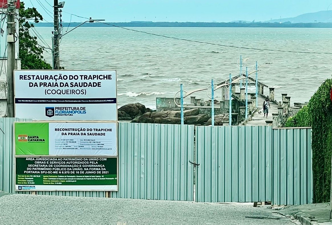 O que era para ser um presente de aniversário para a cidade de Florianópolis tornou-se um símbolo de descaso e burocracia. Trata-se da reconstrução do Trapiche da Praia da Saudade, em Coqueiros, obra que deveria ser entregue há três anos, conforme anúncio feito pela Prefeitura da Capital.