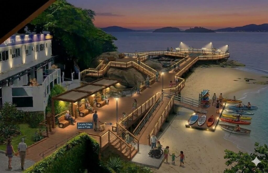 O Contraponto Comunitário: Na mesma reunião, o Conseg 31 apresenta um desenho com uma proposta alternativa: a construção de um deck pelo costão da praia, conectando-se à ilhota por meio de uma ponte.