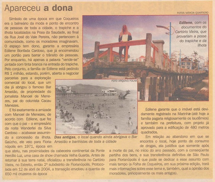 Setembro de 2010: A palavra “Vende-se” aparece pintada no piso do trapiche. A suposta proprietária alega que a concessão fora repassada pelo antigo dono do trapiche ao seu pai e que estaria à venda por R$ 1 milhão.