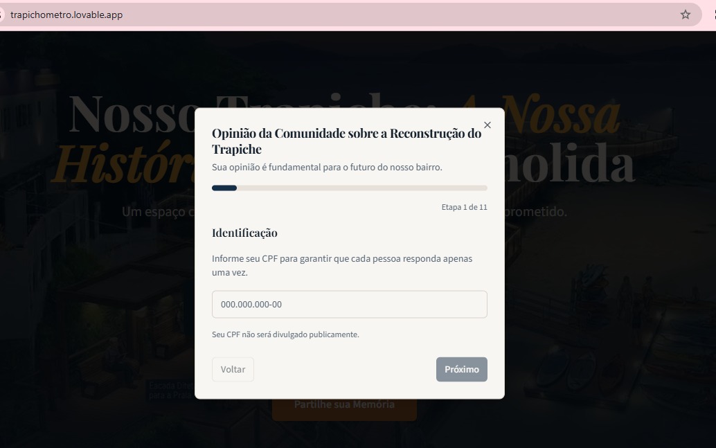 Ao entrar no site pelo link https://trapichometro.lovable.app/ , será apresentado ao usuário um questionário opcional com 11 perguntas, convidando-o a dar sua opinião sobre a Reconstrução do Trapiche. Caso ele não queira responder, apenas terá que “fechar a janela” para ter acesso ao conteúdo do site.