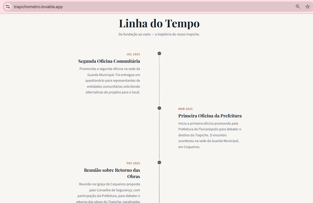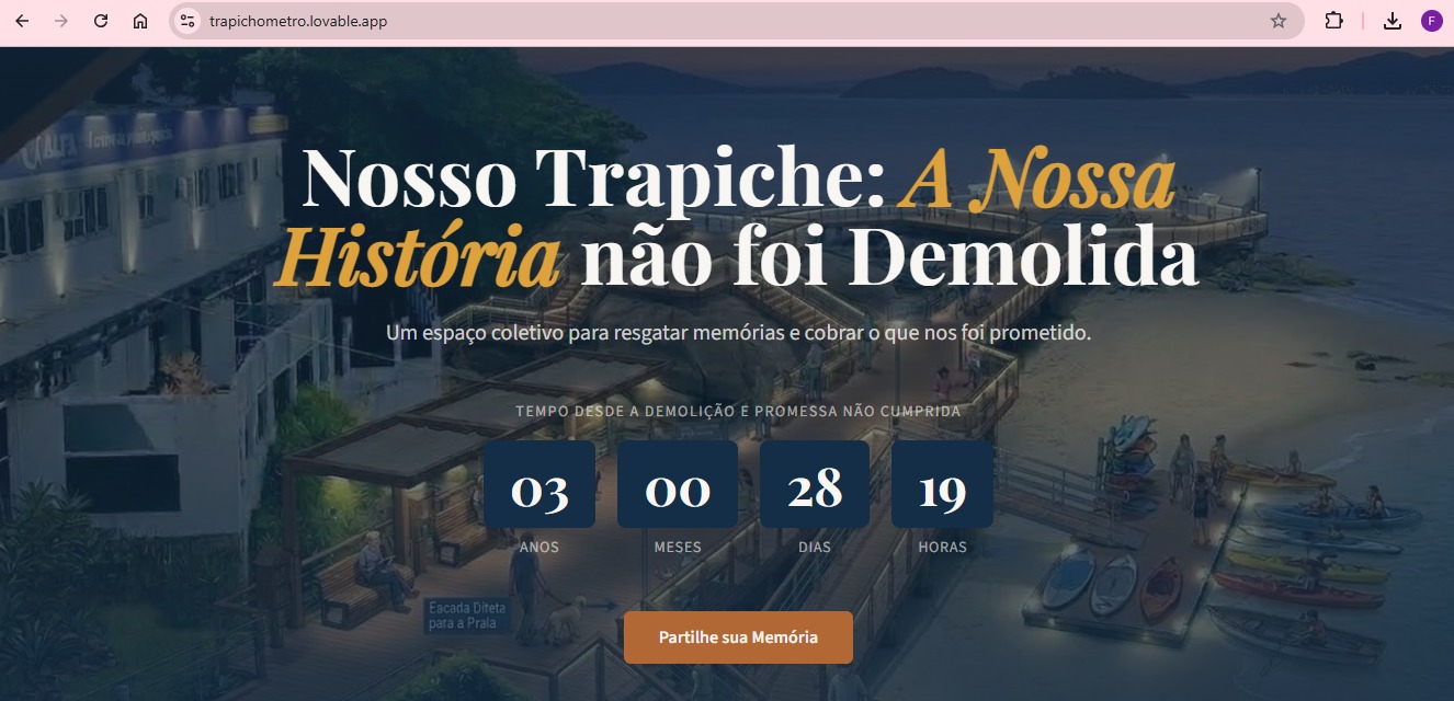 Inconformados com a situação e para dar visibilidade ao tempo de espera da população, moradores de Coqueiros lançam o Trapichômetro (disponível em: trapichometro.lovable.app), uma ferramenta digital que contabiliza, em tempo real, os dias de atraso na entrega da obra. Construído na década de 1960, o trapiche ficava no final da Rua Vereador José do Valle Pereira.