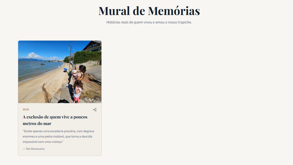 Março de 2026 (Cenário Atual): A comunidade segue com a Campanha “Cadê o Nosso Trapiche?”. O sentimento geral é de que, se o projeto for de fato revisto, que se execute um trapiche moderno e funcional, superior ao projeto anterior que nunca saiu do papel, em vez de deixar o local vazio e com o acesso à praia degradado.