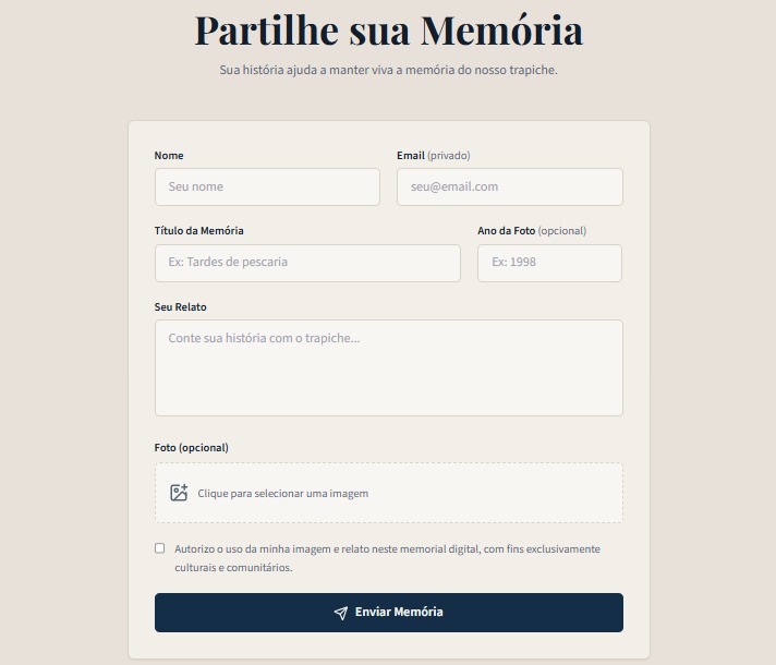 4 – Mural de memórias: Histórias reais de quem viveu e amou o nosso trapiche. Cada usuário poderá registrar memórias no site, através da funcionalidade “Partilhe sua Memória”, onde ele deixará seu nome, seu e-mail, o título da memória, uma foto do Trapiche (opcional), o ano da foto (opcional) e o relato da sua memória. Cada usuário que registrar um momento.