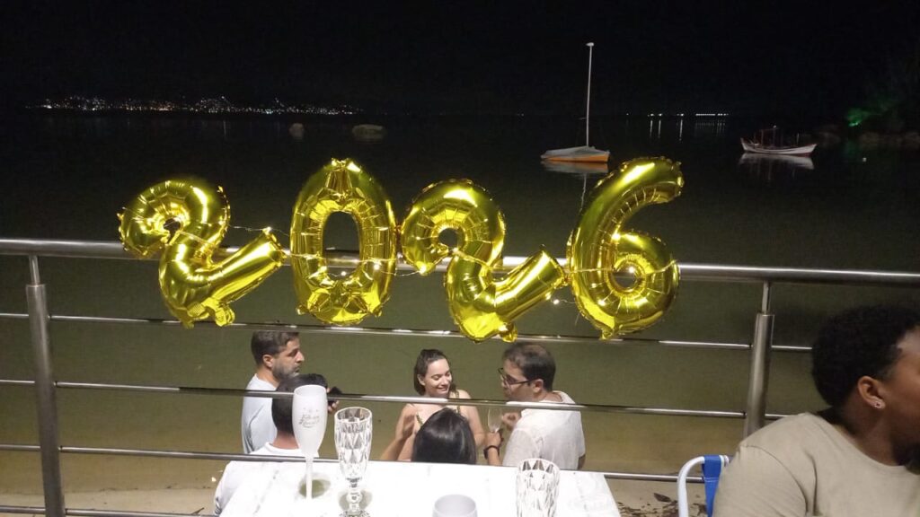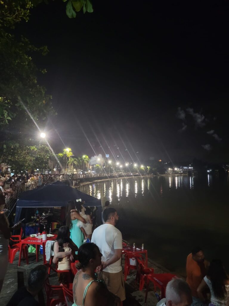 Mais uma vez a Praia da Saudade foi palco de uma bela festa. Um grande número de pessoas se reuniu na orla para celebrar a chegada de 2026 e assistir à tradicional queima de fogos. Mesmo com maré alta e água imprópria para o banho, o pessoal acomodou as cadeiras no pequeno espaço da areia e sentou à beira-mar. O mesmo aconteceu nos deques que ficaram repleto de gente à espera da virada do ano.