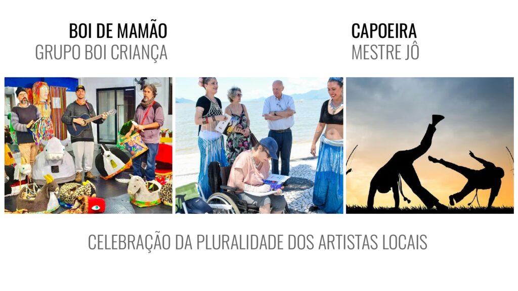 A cultura ancestral manezinha também ganha protagonismo com a apresentação do Grupo Boi Criança, que trará a alegria contagiante do tradicional Boi-de- Mamão. A diversidade cultural continua no solo com: