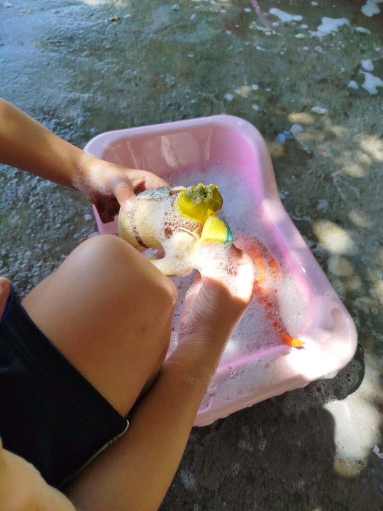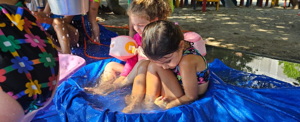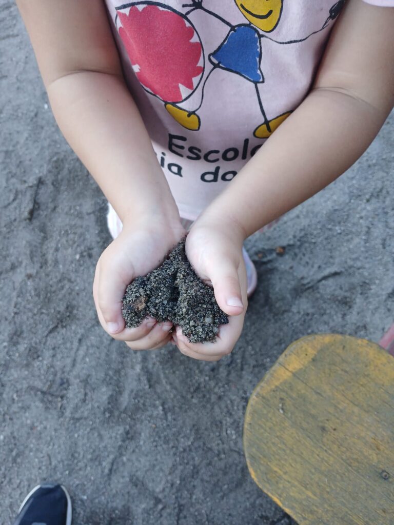 Sem contar, o lanche coletivo – levado pela família de cada turma – que ensina os alunos a partilharem os alimentos. E o melhor: ele é feito em grandes mesas junto à natureza. Ainda no pátio, uma atividade de educação ambiental: o contato com plantas na mini agrofloresta.