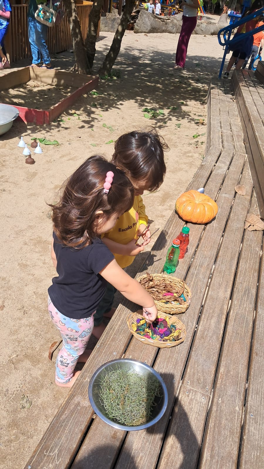 Sem contar, o lanche coletivo – levado pela família de cada turma – que ensina os alunos a partilharem os alimentos. E o melhor: ele é feito em grandes mesas junto à natureza. Ainda no pátio, uma atividade de educação ambiental: o contato com plantas na mini agrofloresta.