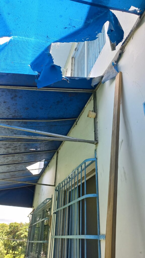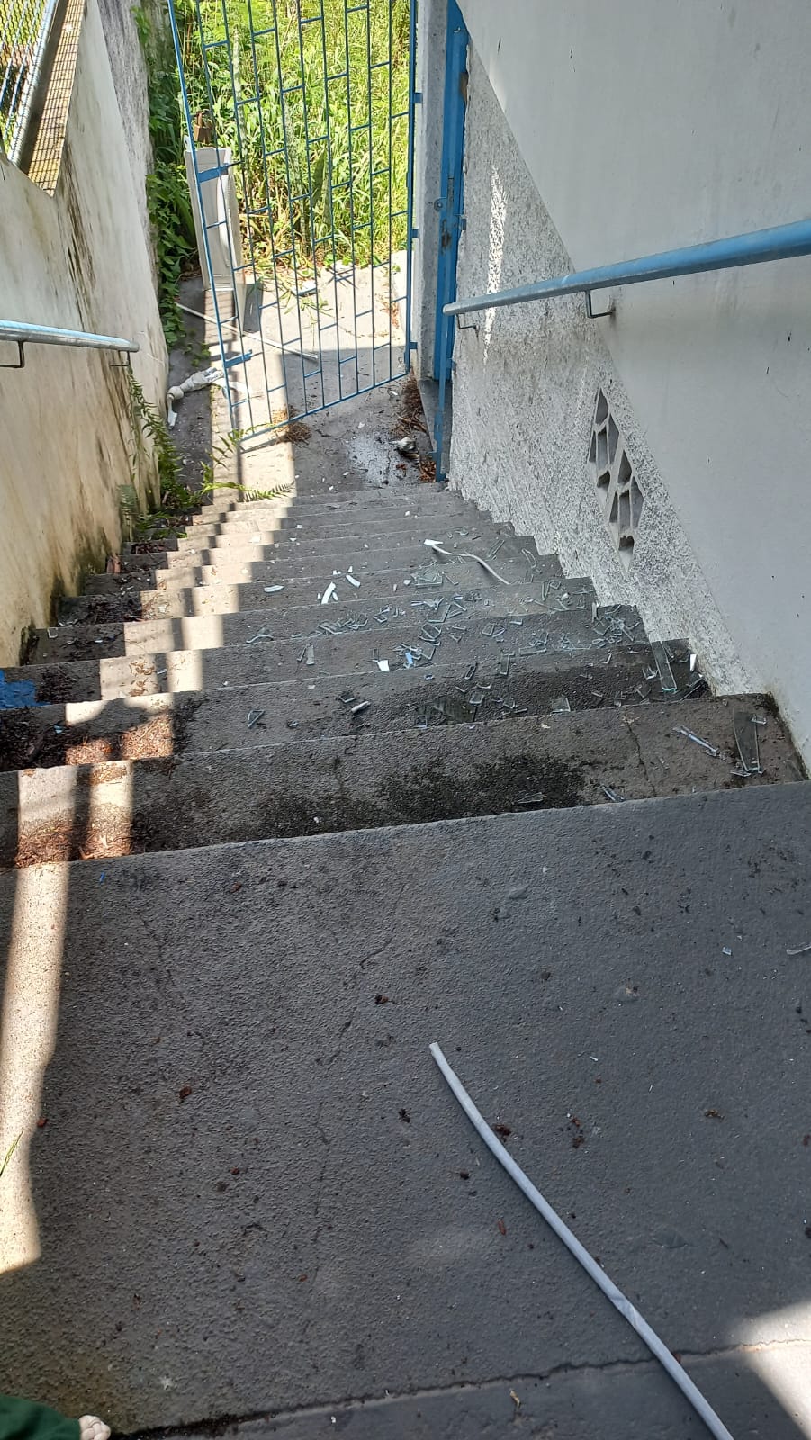 Lona da cobertura rasgada, janela quebrada e vidros espalhados pela escada.