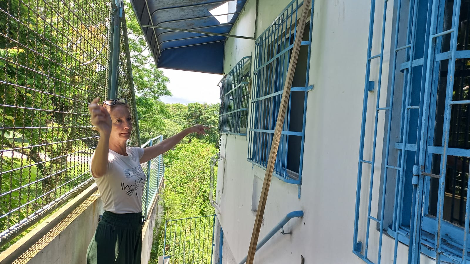 Fonoaudióloga Dayse Costa mostra os fios de energia furtados o que impediu o registro das câmeras
