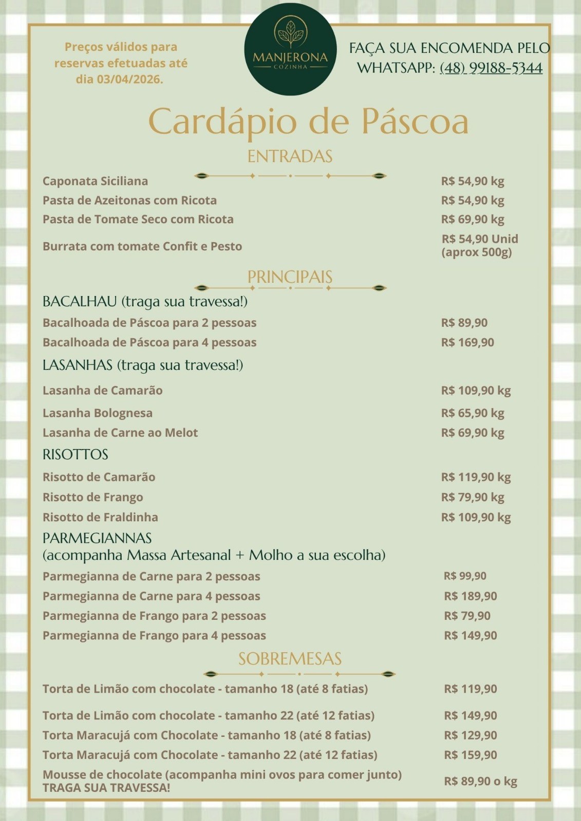 Páscoa Manjerona Cozinha: Sabor e Praticidade na sua Mesa! Confira o cardápio.